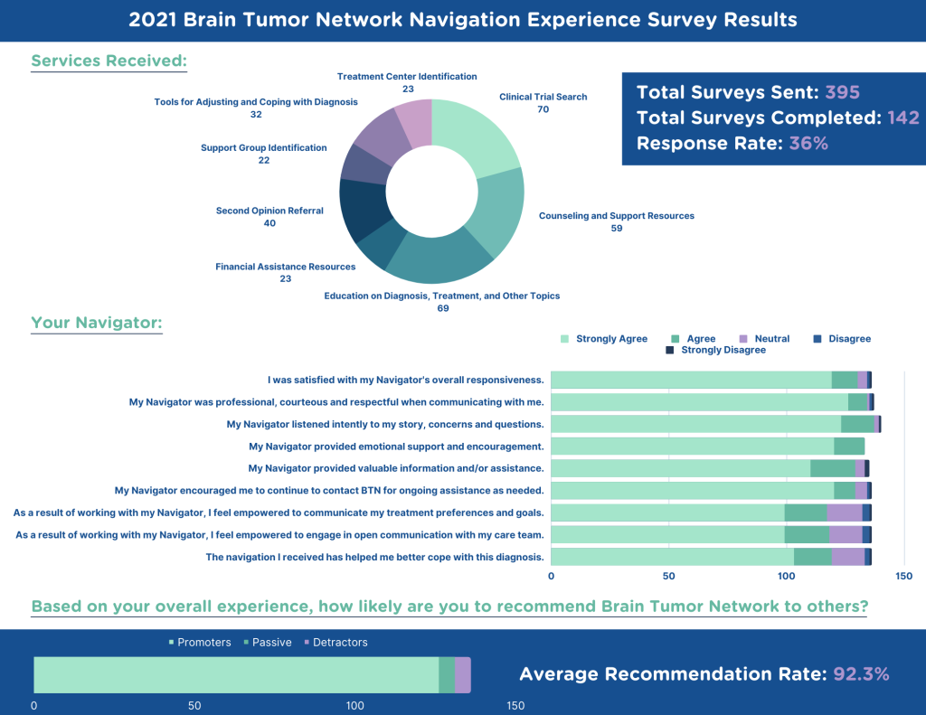 Brain Tumor Network is committed to proving exemplary patient care. As part of our commitment, patients and families are asked to complete a “Patient Experience Survey” after receiving services to assess the care they received and provide feedback. This information is used by Brain Tumor Network leadership to make program improvements and enhancements, and to ensure that our services are effective, efficient, and provided in a way that is helpful to our patients and families.